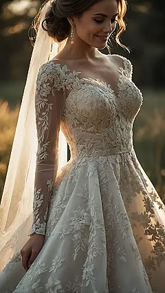 Okay, seriously though, look at this bridal dress! It’s like a fairy godmother waved her wand and added ALL the sparkle and lace. The top part with the high neck and the see-through sleeves covered in delicate patterns looks super fancy, right? And the bit around the neckline and chest just screams “wowza!” It’s the kind of charming dress that makes you feel like a total movie star, ready for your red carpet moment down the aisle.