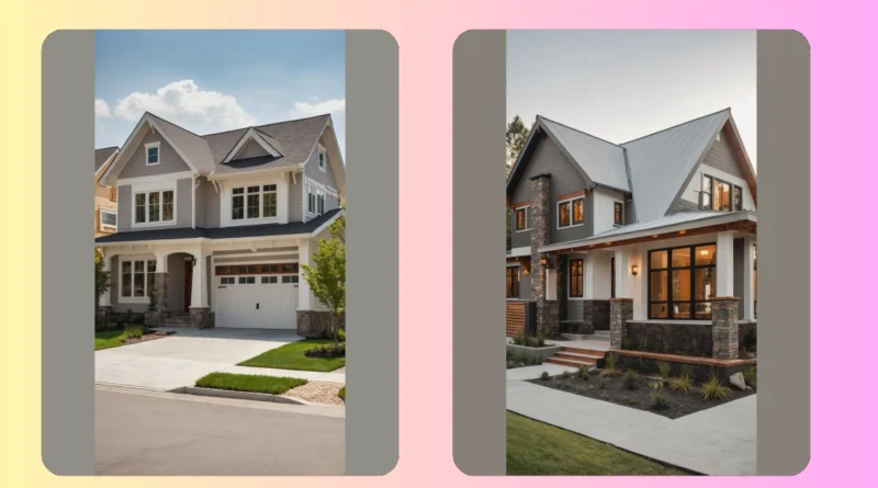 Check out this house! It looks like it was designed by someone who really loves their job, because every detail, from those cool exposed wood beams on the porch to the neat gabled roofs, just screams ‘I’m awesome!’ You can almost feel the solid vibe of this Craftsman house, like it’s saying, ‘Come on in, I’ve got enough sturdy charm to handle anything – even your little brother’s loudest video game session.’ The grey siding and crisp white trim give it that classic, timeless look, and that inviting stone pathway practically rolls out the welcome mat, making you want to grab a lemonade and chill on the porch.
