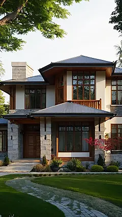 This house totally screams “fancy grandma’s house” but in a good way, like if grandma was also a super-cool architect. It’s got that classic stone and wood thing going on, but the roofline is a little bit edgy, like it’s trying to be modern while still keeping that cozy, traditional vibe. You can almost picture sitting on that little balcony up there, dramatically sipping iced tea and plotting world domination (or just finishing your homework, whatever).