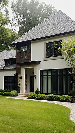 This house isn’t just beautiful; it’s practically begging you to stage a movie scene where someone dramatically runs out, tripping over a perfectly manicured lawn. Imagine the Instagram possibilities! Seriously though, with its sleek dark windows and that gorgeous stonework around the entrance, this place screams “country home” with a major modern upgrade. It’s like a fairytale castle, but instead of a moat, you get a really, really nice lawn. Who needs a dragon when you’ve got this much style?
