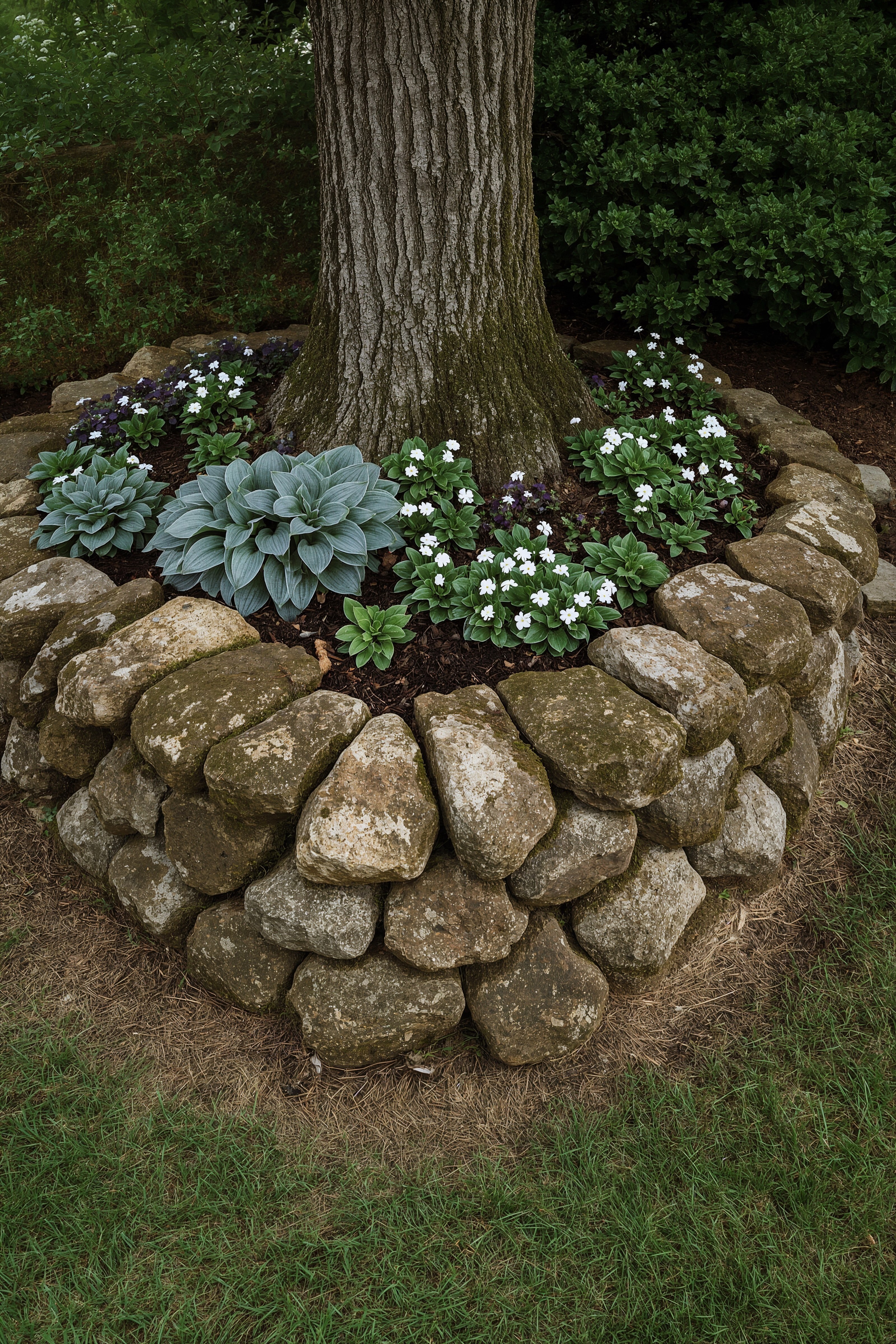 Our focus today is on those charming small corner gardens, especially those nestled around existing trees. These areas offer a wonderful opportunity to blend the natural elegance of trees with the vibrant life of flowers and the grounding texture of rocks.