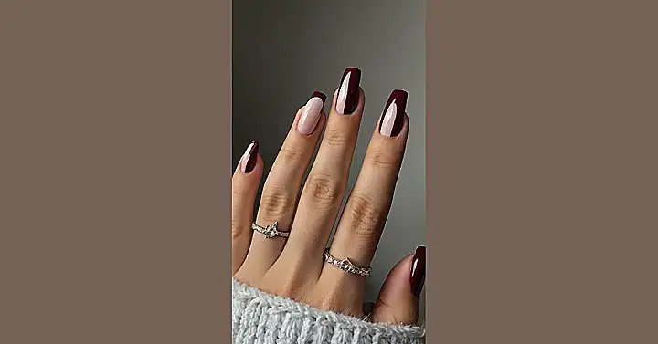 These nails are seriously gorgeous! Imagine walking into a party with these bad boys – everyone will be asking where you got them done. It’s like a sophisticated mix of a cozy autumn evening and a fancy glass of red wine, all on your fingertips. That deep burgundy is totally mesmerizing, and the soft, neutral color complements it perfectly. It’s the perfect balance of “wow” and “wearable”—you know, like the best of both worlds!