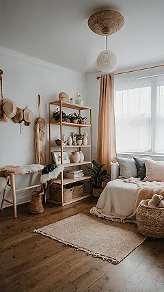 Now, let’s talk about the secret sauce: all those earthy tones and natural textures. Those straw hats on the wall? Not just for sunny days, they’re wall art now! And the plants on the shelves aren’t just there to look pretty; they’re probably judging my questionable snack choices. Plus, those chunky baskets aren’t just for show – they’re where all my “stuff” magically disappears, making the room look clean without me actually having to, you know, *clean* all the time. It’s the perfect spot for chilling, studying (maybe), or just escaping the chaos of life without actually leaving the house. Total game changer!