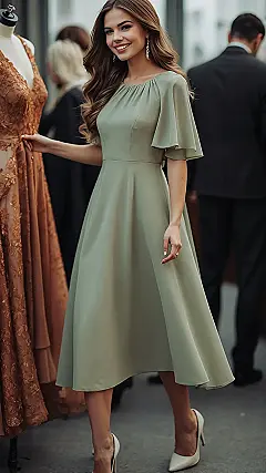Forget trying to figure out algebra, this woman figured out how to make a chic dress look absolutely effortless and classy. That sage green number? It’s basically saying, ‘Yeah, I’m sophisticated, but I can also totally nail a TikTok dance if I wanted to.’ With those flutter sleeves and that perfect knee-length, she’s giving off major ‘I probably have my life together’ vibes, which is impressive since most of us are still trying to match our socks. It’s the kind of outfit that makes you instantly feel like you should be sipping fancy sparkling water, not just a soda.