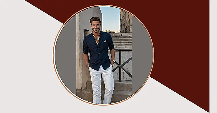 Check out this dude! He’s rocking an outfit that practically radiates good vibes and style points. With that super confident smile, it looks like he just aced a test he didn’t even study for, or maybe found a twenty-dollar bill in his old jeans. Who knew a navy blazer, usually reserved for stuffy events, could look so cool when paired with a wild, patterned shirt that’s practically a tropical vacation itself? He’s basically telling all other stylish mens outfits to step aside, because he’s here to show them how it’s done, effortlessly.