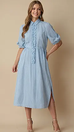Get ready to channel some serious sunshine vibes in this super cute midi dress! It’s that perfect shade of light blue that basically screams “I’m having a good day!” before you even open your mouth. Those cool vertical stripes are like a secret fashion hack to make you look extra tall, and the playful ruffles down the front are totally giving us ‘fashionable pirate, but make it chic’ energy. Plus, those slightly puffed sleeves are just the right amount of fancy without making it look like you’re trying too hard – which, let’s be real, is the ultimate goal.