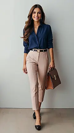Imagine walking into the office looking like *that*. You’d definitely be turning heads, maybe even get an extra cookie in the breakroom! This outfit is all about feeling confident and ready to conquer the day. The dark blue shirt paired with those light pink pants? Chef’s kiss! It’s like saying, “I’m professional, but I also know how to rock a pastel.” Plus, that briefcase is like the ultimate “I mean business” accessory.