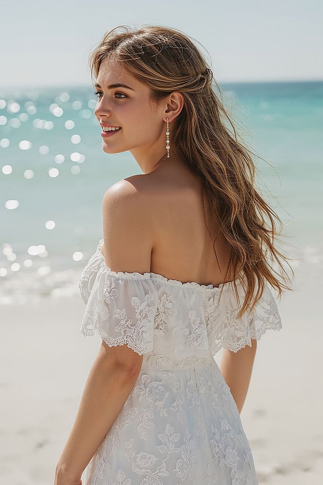 Achieve a carefree beach wedding vibe with these elegant bridal hair down waves, ideal for the Long Hair For Bride. This Boho Half Updo perfectly balances relaxed bridal hair inspiration with chic styling.