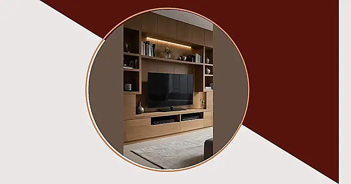 But it’s not just about shoving stuff out of sight. Look closely at the image – the cupboards are part of the whole cool wall unit design. They blend in perfectly with the shelves up top where you can proudly display your favorite books or cool decorative items. It’s a clever way to keep the practical stuff hidden away downstairs while showcasing the cool parts upstairs, making your living room look stylish and totally put together without feeling cluttered.