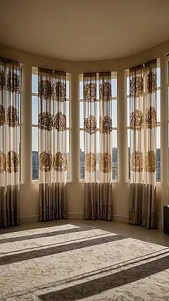 And talk about an office view! These curtains are truly living their best life, draped elegantly with that breathtaking ocean right outside their “window office.” While we’re all scrambling to find a matching sock in the morning, these majestic room curtains are just hanging out, subtly showing off their fancy embroidery and letting just enough sunlight peek through to perfectly illuminate your messy bed. They’re basically the VIP bouncers for your windows, making sure only the coolest rays (and maybe a polite seagull or two) get invited in, all while looking effortlessly fabulous.