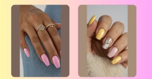 These nails are giving major autumn vibes! Just like the leaves changing colors, these nails are a mix of gold, pink, and purple with some shimmery sparkle. It’s like the perfect combination of a classic French manicure and a cozy sweater, ready for pumpkin spice lattes and crisp fall air.