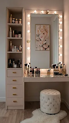 Stepping into a makeup room like this is basically like having your own personal Hollywood set! With all those bright, beautiful bulbs around the mirror, you’d never have to worry about walking out looking like you applied your blush in the dark (we’ve all been there, right?). This isn’t just a mirror; it’s a spotlight for your daily glow-up, making sure every sparkle and shade is just right before you face the world. Plus, sitting on that plush ottoman, you’d feel like a total VIP prepping for the red carpet, even if you’re just heading to school or hanging out with friends.