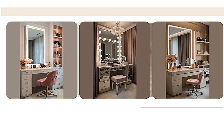 Stepping into a makeup room like this is basically like having your own personal Hollywood set! With all those bright, beautiful bulbs around the mirror, you’d never have to worry about walking out looking like you applied your blush in the dark (we’ve all been there, right?). This isn’t just a mirror; it’s a spotlight for your daily glow-up, making sure every sparkle and shade is just right before you face the world. Plus, sitting on that plush ottoman, you’d feel like a total VIP prepping for the red carpet, even if you’re just heading to school or hanging out with friends.