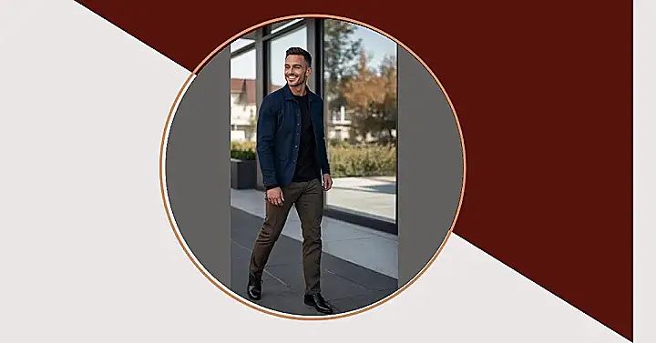 Take a look at this guy, beaming with a smile that just screams, ‘My outfit is on point!’ He’s nailed the perfect ‘pants outfit for men’ with a smart blue shirt and super crisp white pants. This combo isn’t just easy to wear; it’s practically a superpower for looking sharp and confident, whether you’re heading to a casual hang-out or somewhere a bit more fancy. Those bright white pants really stand out against his cool blue top, making a statement that says you know how to dress without even trying too hard.