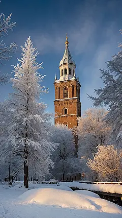 Look at this place! It’s like Mother Nature decided to go all out with the glitter and frost, turning everything into a real-life winter postcard. This isn’t just a pretty picture; it’s practically begging to be your new winter wallpaper. Just imagine opening your phone or computer to this every day – you’d almost forget you have homework to do! The trees are totally rocking their snow outfits, looking like giant, fluffy white cotton candy, and that brick tower is standing tall, probably wondering why everyone else gets to be covered in snow while it just gets a fancy hat. Definitely an upgrade from that old picture of your cat trying to eat a houseplant, right?