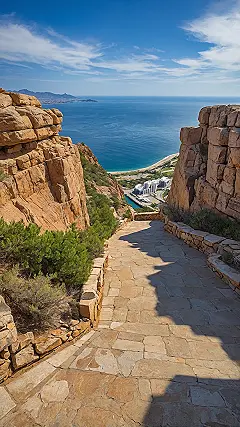 Peeking out between those big rocks, you can see the buildings of the city and the bright blue ocean stretching out. From this high point, everything down there looks way less stressful, like finding a quiet corner in a crowded lunch hall. It totally proves you can find super serene places, perfect for just breathing or thinking about snacks, even when you’re not miles away from everything – sometimes, awesome tranquility is just up (or down!) a cool set of steps near civilization.