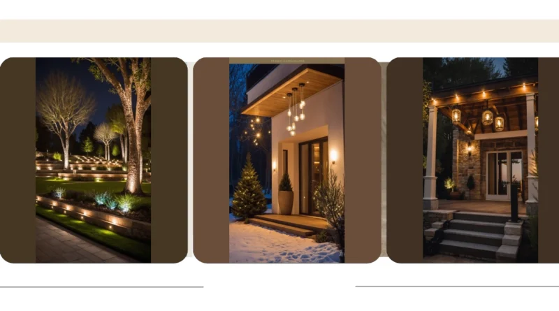 Notice how the lights aren’t just thrown up willy-nilly? We’ve got those sleek uplights giving the stone pillars a dramatic hug, and subtle ceiling lights making the whole porch feel extra cozy, like a fancy outdoor living room. Your house wouldn’t just be surviving December; it would be absolutely glowing! Forget boring plain exteriors; with lighting like this, your place becomes the neighborhood’s undisputed shining star, practically whispering, “Come on in, but first, admire my awesome outdoor vibe!” Even the grumpiest winter night wouldn’t stand a chance against this level of cool.