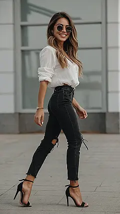 This picture screams “I’m cool, calm, and collected!” The girl in the image is rocking a super simple but totally classy look. She’s got the whole “I woke up like this” vibe going on, even though we all know she totally put effort into looking this amazing. That white shirt and those ripped jeans just say, “I’m stylish but comfortable,” and the heels add just the right touch of “I’m ready to take on the world.”