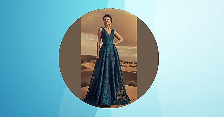 That rich teal color and all the intricate lace on her dress scream elegance, making it the kind of classy gown you dream of wearing to make a grand entrance. She’s got that confident pose down, like she’s daring the desert winds to mess up her hair or, gasp, get sand on her beautiful hem. Let’s be real, most of us would be tripping over our own feet in a t-shirt out there, but she’s making looking glamorous in the middle of nowhere seem totally effortless. Just remember to shake all the sand out before you head to the after-party!