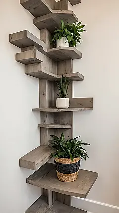 You know those awkward corners in your room that usually just collect dust or become the hiding spot for forgotten socks? Well, prepare to have your mind blown! These aren’t just any corner shelves; they’re like a VIP lounge for your plants, turning a forgotten space into a mini-jungle masterpiece. With their cool, staggered wood design, even the shiest snake plant gets a chance to shine, climbing its way up to botanical stardom. It’s basically interior design’s way of saying, “No corner left behind!”