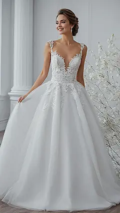Check out this absolutely stunning dress! It’s giving serious main character energy with all that intricate lace and the way the skirt just flows like a dream. You can practically hear the “oohs” and “aahs” as someone glides down an aisle in this beauty, probably making everyone wish they had a dress this gorgeous. And while it might look like a classic wedding gown, if you look closely, it’s rocking a super chic, subtle hint of color – like a beautiful champagne or soft gold, which is basically the dress equivalent of saying, “I’m fancy, but also I know how to have a good time without being too loud.”