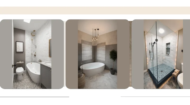 Stepping into this newly remodeled bathroom feels less like a quick rinse-off spot and more like a secret escape to a fancy spa! With that gorgeous freestanding tub just begging for a bubble bath and the super stylish glass-enclosed shower, you might actually start looking forward to getting clean. The cool pebble floor looks like a natural riverbed, which is way more interesting than plain tiles, and that big green plant isn’t just for decoration; it’s probably giving you major zen vibes while you brush your teeth.