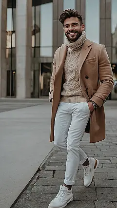 Hey there, fashion-forward fellas! Check out this dude rocking the ultimate men’s winter fashion look. Seriously, that camel-colored coat is *everything*. It’s like a warm hug for your body, and it looks super sophisticated without being stuffy. Pair it with a cozy cream sweater (bonus points for a chunky knit!), some crisp white pants (who knew they could be so cool in winter?), and some snazzy white boots, and BAM! You’re officially ready to conquer any winter chill – and maybe even impress a few people along the way. Think less “snowflake” and more “stylish snowman.”