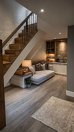 Notice that mega-soft rug? It’s practically daring you to try a wrestling match, but then you’d probably just sink into its comfy goodness. And look at all those different places to plop down: the big sectional, that cool tufted ottoman, and even a squishy beanbag chair for when you want to truly become one with the floor. This place is set up for epic movie nights where the only drama is whether to get more popcorn, or maybe an intense board game session. Just be careful not to roll down those sleek stairs after getting too relaxed; they lead right back to reality!