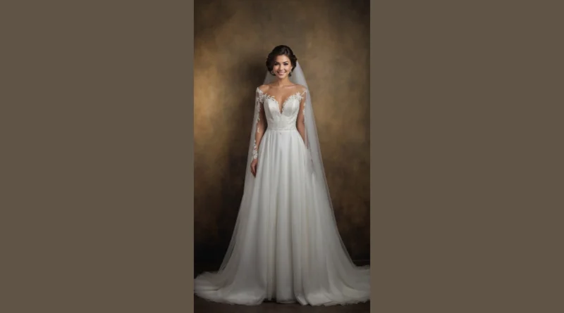 Looking at this picture, you can totally tell this bride is ready for her big day, rocking a smile that’s brighter than any diamond! Her wedding dress, with that fitted top, totally looks like a fabulous corset wedding dress, giving her that amazing, perfectly sculpted shape. It’s like the dress itself is giving her a super confident hug, making sure she looks absolutely flawless for every single photo. You can almost hear the “oohs” and “aahs” as she walks down the aisle, all thanks to that blend of lace, elegance, and a little bit of structural magic.