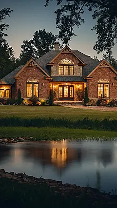 This brick beauty is the definition of a “beautiful country home.” Just look at it โ all cozy and glowing at dusk, like a giant gingerbread house ready for a fairytale! Imagine roasting marshmallows by the lake while watching fireflies dance; it’s practically begging for a summer BBQ and some serious fun. I bet even the ducks think this place is super fancy!