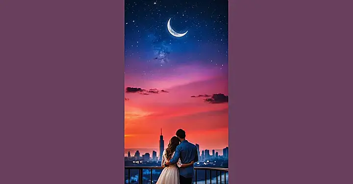 This picture practically screams “relationship goals” louder than a pop concert! You’ve got this super cute couple, all wrapped up in a hug, gazing out at a city skyline that’s putting on an epic light show. The sky itself is a masterpiece, fading from a deep, starry blue with a shy crescent moon into a fiery pink and orange sunset. It’s like nature decided to splash all its best colors on the canvas just for these two, making it the perfect ‘couple wallpaper’ if you want your phone to emit peak romantic comedy vibes. They probably just finished arguing about whose turn it is to do the dishes, but you’d never know from this picture!