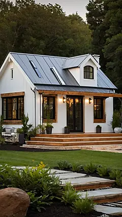 This isn’t your grandma’s boring white cottage; it’s got a cool, modern vibe going on. The black trim gives it a bit of an edge, and the shiny roof looks almost futuristic. It’s the kind of place where you could imagine having the best parties, or maybe just chilling with your friends and binge-watching your favorite shows. Who knows, maybe one day you’ll own a cottage just like this one!