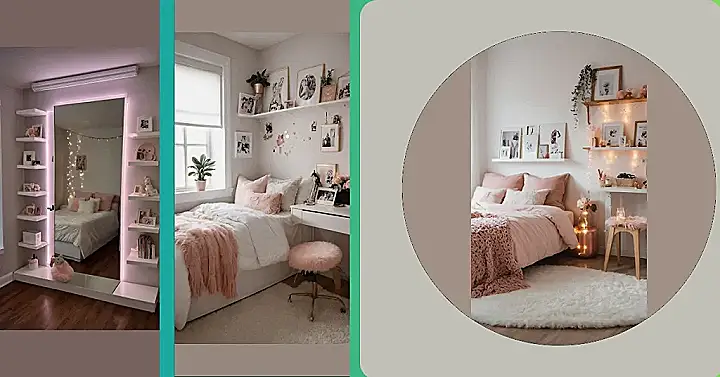 Beyond the epic mirror, this room is a masterclass in cozy chic. Those stacked shelves are the perfect stage for all your treasures, from adorable stuffed animals that still spark joy to framed pictures of your squad. It’s organized without being boring, letting your personality shine through every little detail. With the soft pink and white vibes, plus that inviting bed, this space is basically begging you to curl up with a good book, binge-watch your favorite show, or host a marathon gossip session with your best friends. It’s the ultimate hangout spot that’s totally stylish and uniquely yours.