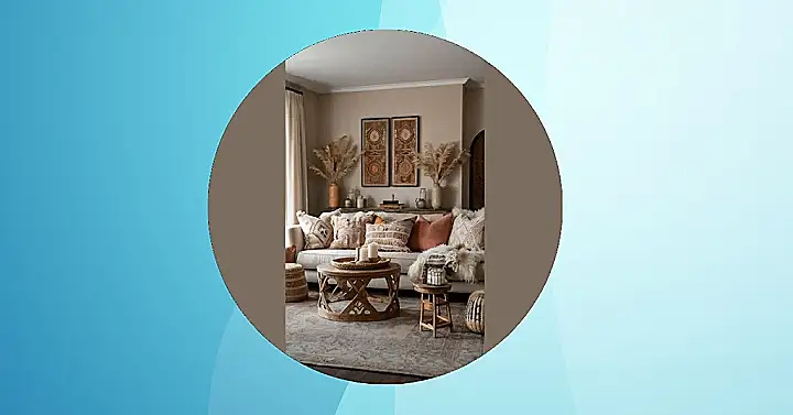 **Paragraph 1:** Whoa, check out this living room! It’s like stepping into a super-relaxed, earthy paradise. All those fluffy pillows and blankets make me want to curl up with a good book and never leave. The colours are so calming—think sandy beaches and warm sunsets. And those tall, feathery plants? They’re like nature’s stylish decorations! The whole vibe screams “boho chic,” which basically means it’s super comfy, has a bunch of natural elements, and feels totally unique and awesome. It’s a space that just invites you to relax and let go!