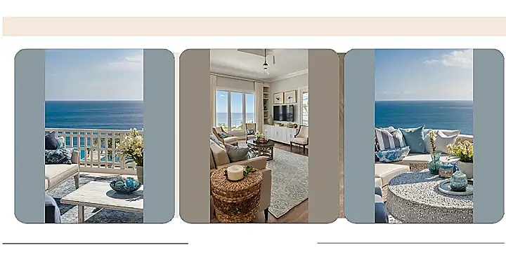 Look at this place! It’s like someone took a chill beach day and turned it into a living room masterpiece. You’ve got that fancy ‘coastal chic’ vibe going on, with comfy sofas perfect for sinking into after… well, whatever you do before relaxing here. Who needs TikTok when you have a view like that? Your toughest decision here is probably whether to watch the waves crash or take a power nap on that ridiculously fluffy rug. It’s basically permission to totally chill out, but make it look amazing.