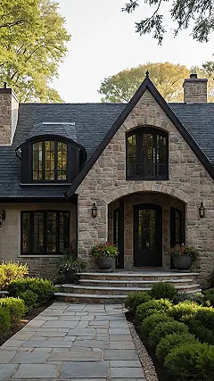 Who knew history could look this cool? This isn’t your grandma’s old Tudor house; it’s like a medieval castle decided to hit the gym and get a total fashion makeover. Look at those awesome chunky, light-colored stone walls – they give off major ‘ancient fortress’ vibes, but then you see the super sleek black window frames and that sharp, dark roof, and boom! You’re back in the 21st century. It’s the perfect mash-up of old-school charm and modern cool, proving that some styles just get better with age, especially when they get a fresh, trendy twist that screams sophistication.