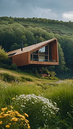 This picture is like a scene straight out of a dream! Imagine waking up in this cool, modern house surrounded by a beautiful forest and a field of wildflowers. It looks like the perfect place to forget about all your worries and just relax. The house is tucked away from the hustle and bustle of city life, right in the heart of nature, which seems pretty awesome, don’t you think?