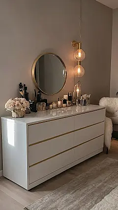 Check out that slick white dresser with its gold stripes – it’s like the furniture equivalent of a cool, confident friend who always has their life together. And that round mirror? It’s practically begging for you to take a selfie. But let’s be real, while our current desks might be buried under textbooks and questionable snack wrappers, this image proves that ‘aesthetic room decor’ doesn’t just happen; it’s practically a superpower. Imagine having a space so calm and organized, you actually *want* to put things away! It’s enough to make even the most chaotic among us dream of a world where our makeup brushes are this neat and our candles are this chic.