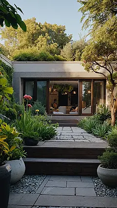 Hey there, future gardeners! Check out this totally awesome small cozy garden. It’s like stepping into a tiny slice of paradise, right outside someone’s back door. Imagine: you’ve got this super-stylish house with big, welcoming doors that practically yell, “Come on in and relax!” But before you even get to the comfy interior, you’re greeted by this charming, peaceful garden. It’s perfectly sized – not too big to be overwhelming, and not too small to feel cramped. It’s just right for enjoying a quiet afternoon with a good book, or maybe just chilling out after a long day at school. The plants look happy, and the stepping stones are like a secret path to ultimate relaxation.