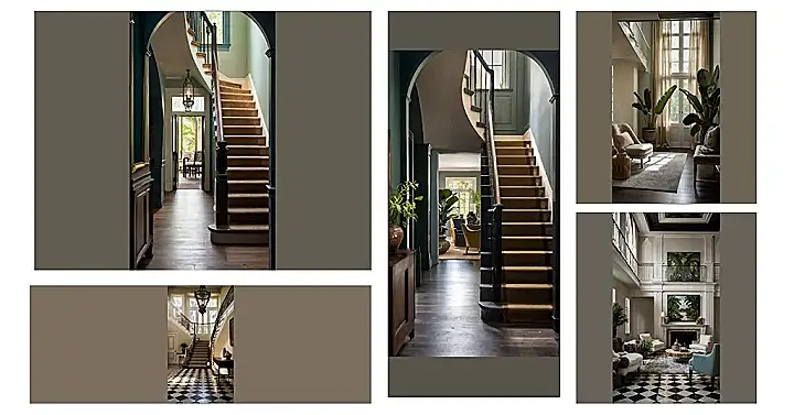This house screams “southern interior,” doesn’t it? With those fancy stairs, the moody blues and greens, and that breezy glimpse of the outdoors, you just know this place has seen some sweet tea spilled and maybe even a ghost or two! It is like a snapshot of a classic movie set, where maybe someone is running up or down the stairs, or getting ready to make a big entrance!