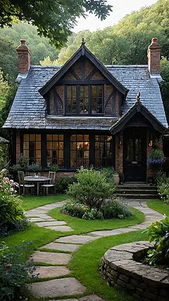 This house is like something straight out of a storybook! Imagine a cozy English village, with cobblestone streets and quaint shops, and a little cottage tucked away amongst the greenery. This is it! It’s got that classic black and white timber framing that looks like it’s been around for centuries, and those big windows let in all the sunshine. You can almost picture yourself sipping tea on the patio with a good book, listening to the birds chirping in the garden.