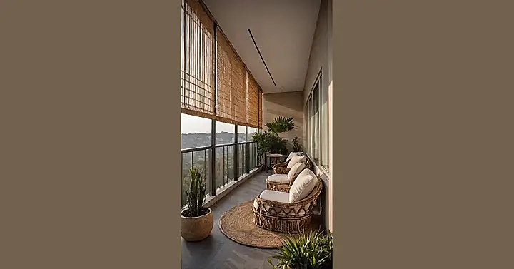 And check out the details! Those woven bamboo blinds aren’t just for blocking out the sun; they’re also excellent for dramatic curtain reveals or hiding from chores. Plus, with all those vibrant green plants strategically placed, it’s like your own personal, low-maintenance jungle – no bug spray required! The cozy round rug and the perfectly sized side table for your phone (or a secret stash of cookies) show that every part of this balcony design is screaming ‘relax.’ It’s proof that with a little creativity, your outdoor space can go from ‘just a balcony’ to ‘my awesome escape pod from reality!’