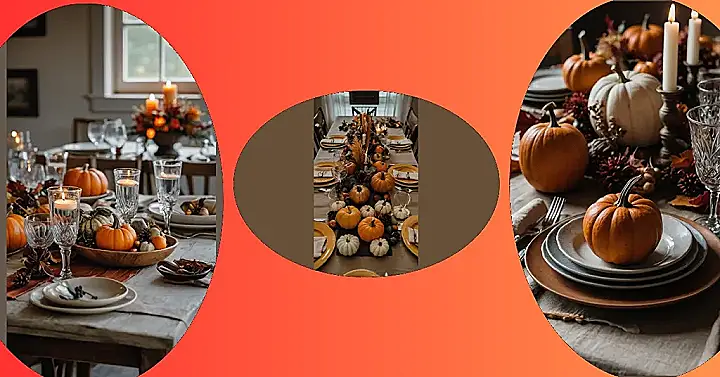 This picture screams “fall” with all the pumpkins and warm colors! It looks like someone’s getting ready for a delicious Thanksgiving feast. The table setting is perfect for a cozy dinner party, with the amber glasses and candles adding a touch of elegance. If I were a guest, I’d be so excited to dig into a plate of pumpkin pie after this meal!
