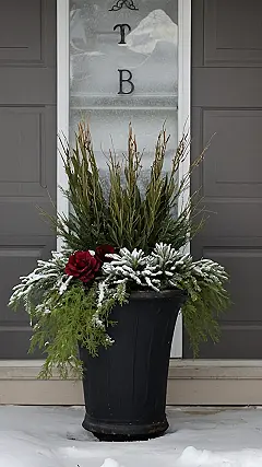 This planter is like a little winter wonderland right on the front porch! The snowy branches are just starting to peek out from their frosty home, and those red flowers are adding a pop of color that really brightens up the scene. It’s like a tiny snow globe full of festive winter cheer.