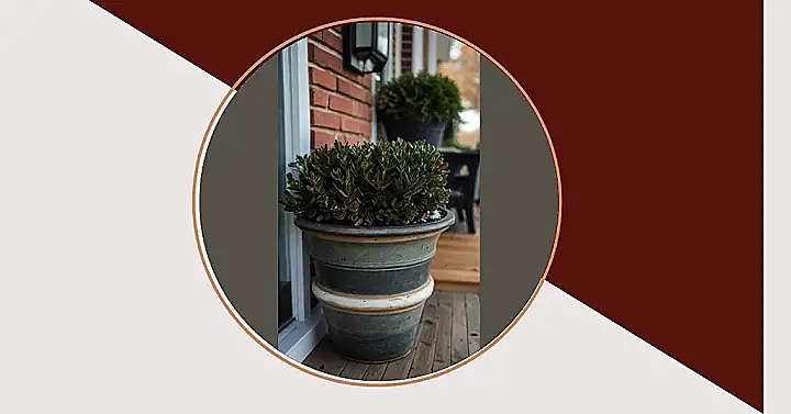 This planter is like a little winter wonderland on your front porch! It’s full of green plants and a cool, shiny ornament that looks like a little ice ball. It’s almost like the planter has its own little mini-snowstorm going on, but don’t worry, it won’t leave any mess on your porch!