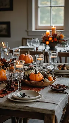 This picture screams “fall” with all the pumpkins and warm colors! It looks like someone’s getting ready for a delicious Thanksgiving feast. The table setting is perfect for a cozy dinner party, with the amber glasses and candles adding a touch of elegance. If I were a guest, I’d be so excited to dig into a plate of pumpkin pie after this meal!