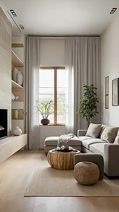 Imagine walking into a living room so chill, it’s basically meditating. That’s what this picture screams! Everything’s got this neutral, calm color vibe going on, like a beige hug for your eyeballs. There are even little potted plants on a shelf, just vibing. If you want your living room to be the opposite of a chaotic school hallway, this zen style is definitely the way to go!