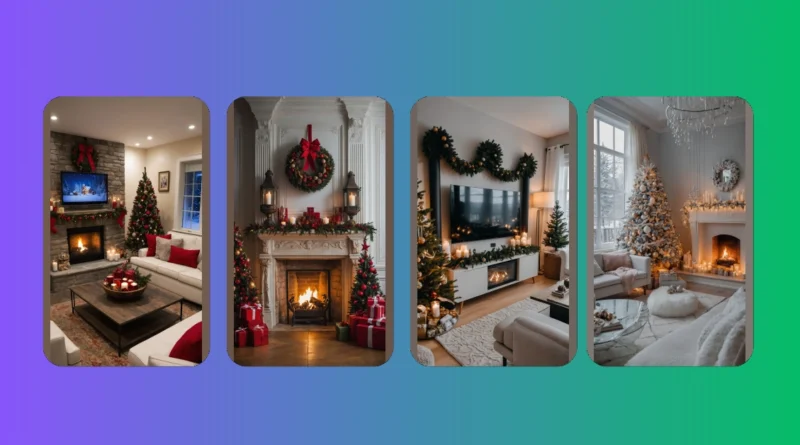Step right up to the most Instagram-ready spot in the Christmas living room! This mantelpiece isn’t just decorated; it’s practically throwing a silent, elegant party. Look at those little frosted trees, standing tall like a fancy winter forest, probably whispering secrets about who’s getting the best presents this year. And the candles? They’re all lined up, flickering away, probably competing for the “most glow-up” award. You can almost hear them humming festive tunes while making the whole room feel super cozy.