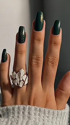 This nail art is totally giving us autumn vibes! The deep green color reminds us of the leaves changing on the trees and the gold flecks look like the last bit of sunshine peeking through the branches. It’s a bit like a fancy forest on your fingertips!