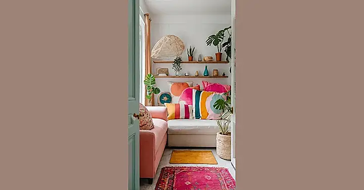 Stepping into this room is like someone decided to make happiness contagious, and they started with the decor! Forget boring beige; this space is a masterclass in ‘dopamine decor,’ where every cushion practically beams with good vibes. The super squishy pink couch and those playful pillows, bursting with oranges, hot pinks, and cool blues, are basically mood boosters in fabric form. Your brain probably gets a little happy buzz just looking at all the colors dancing together, making this room feel less like a room and more like a permanent smile.